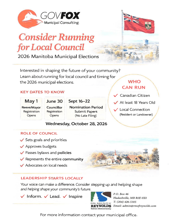 Are you interested in the future of the RM of Reynolds? The 2026 Manitoba Municipal Elections are approaching, and leadership starts locally. Your voice can make a difference by setting goals, approving budgets, and advocating for our community’s needs.